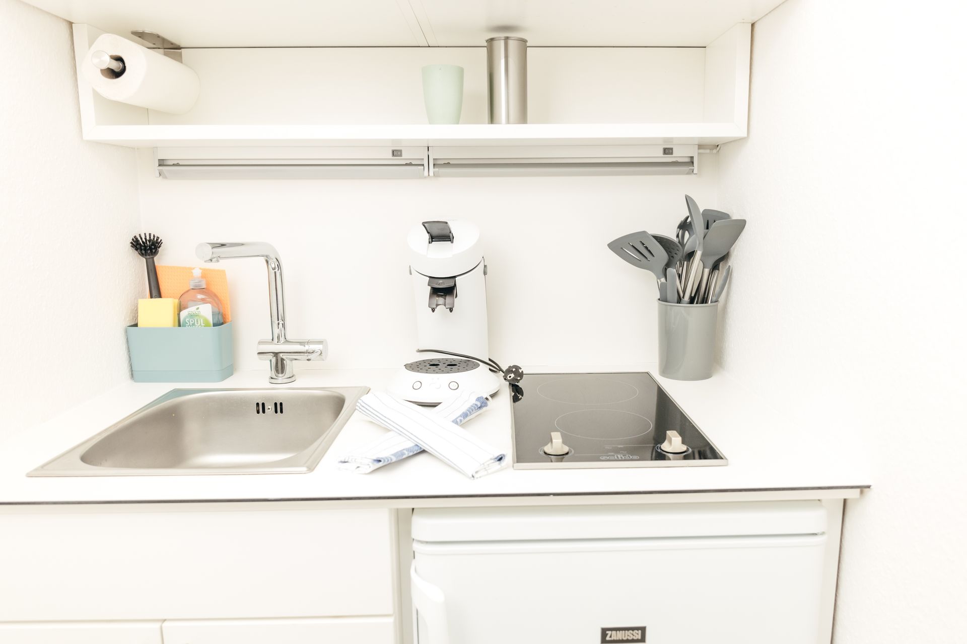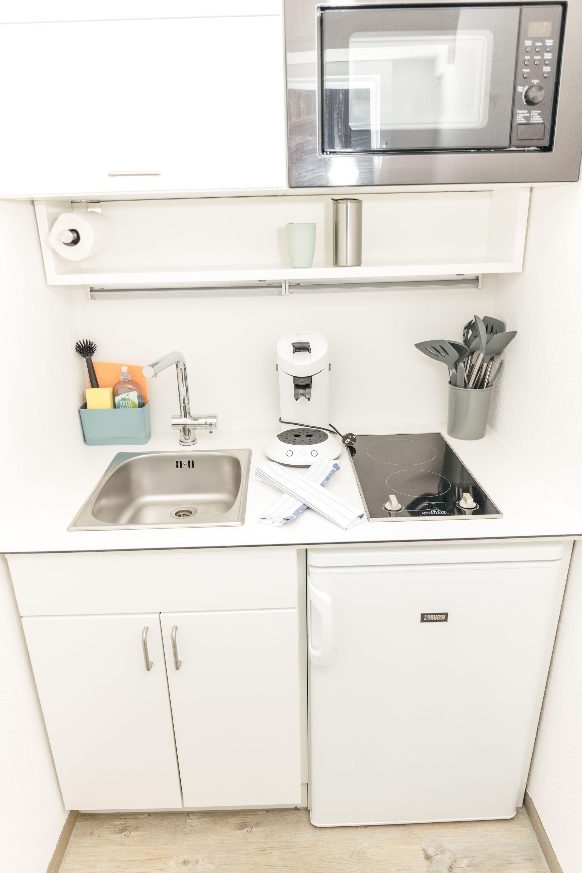 ✅Kleine Küche mit Wasserkocher, Toaster, Mikrowelle, Kühlschrank mit Gefrierfach, ❌Kein Geschirrspüler