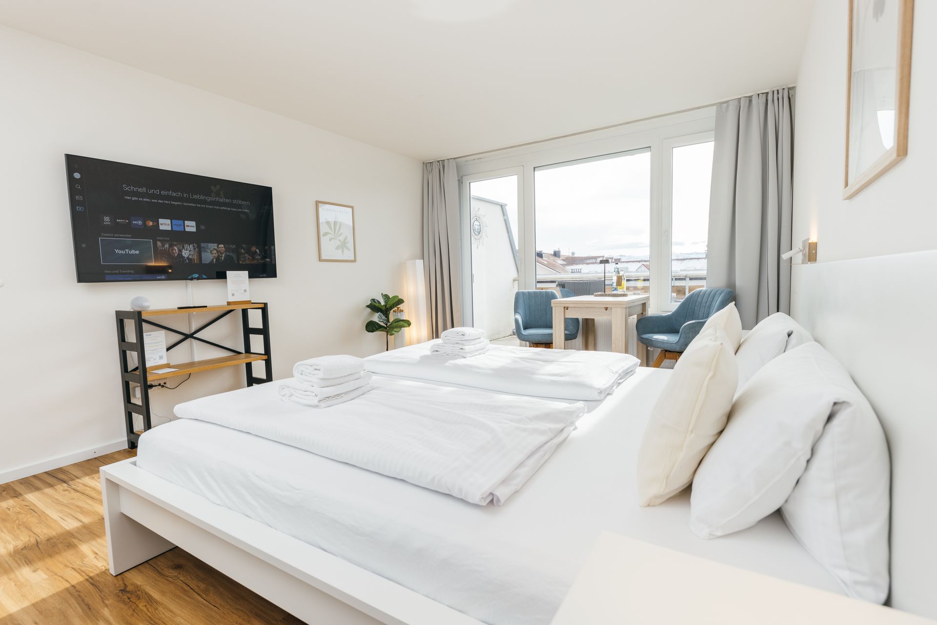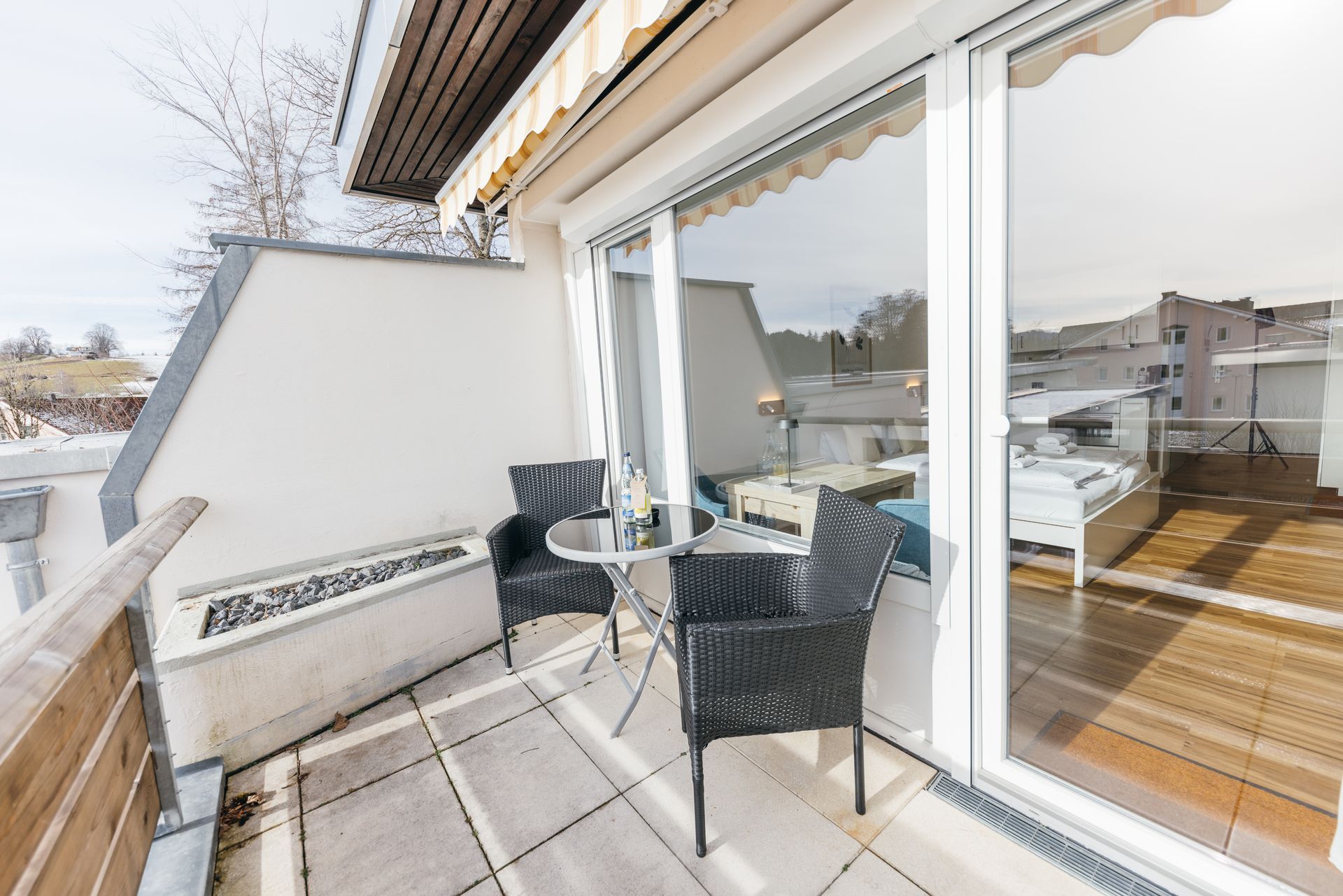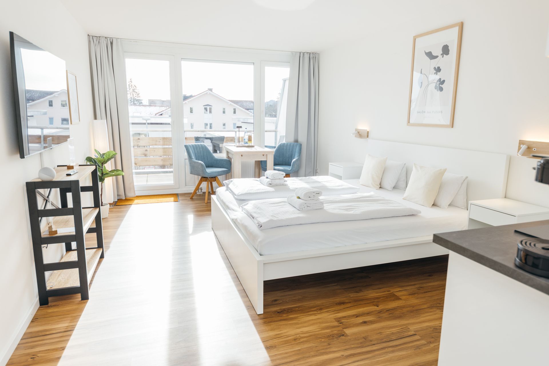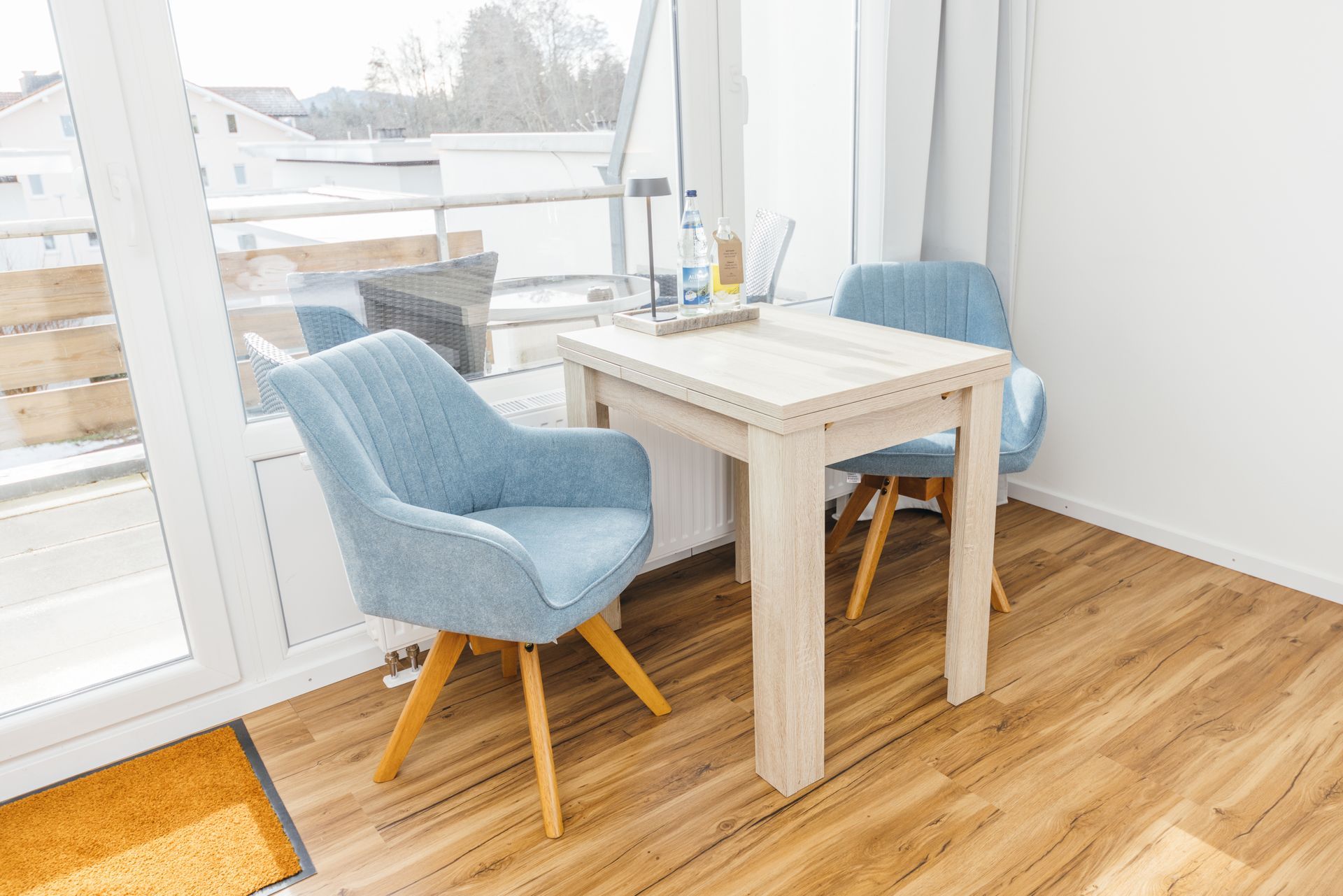 Unser App. 201 ist perfekt für einen Urlaub zu zweit. Alles was Sie brauchen, finden Sie hier. Vom Balkon hat man freie Sicht bis Sulzberg und sieht die Alpen über den Dächern hervorschauen. Das Bad ist mit einer Dusche ausgestattet. Die Wohnung hat eine doppelte Schallschutz-Verbindungstür zu App. 202 und kann auch zusammen gebucht werden.