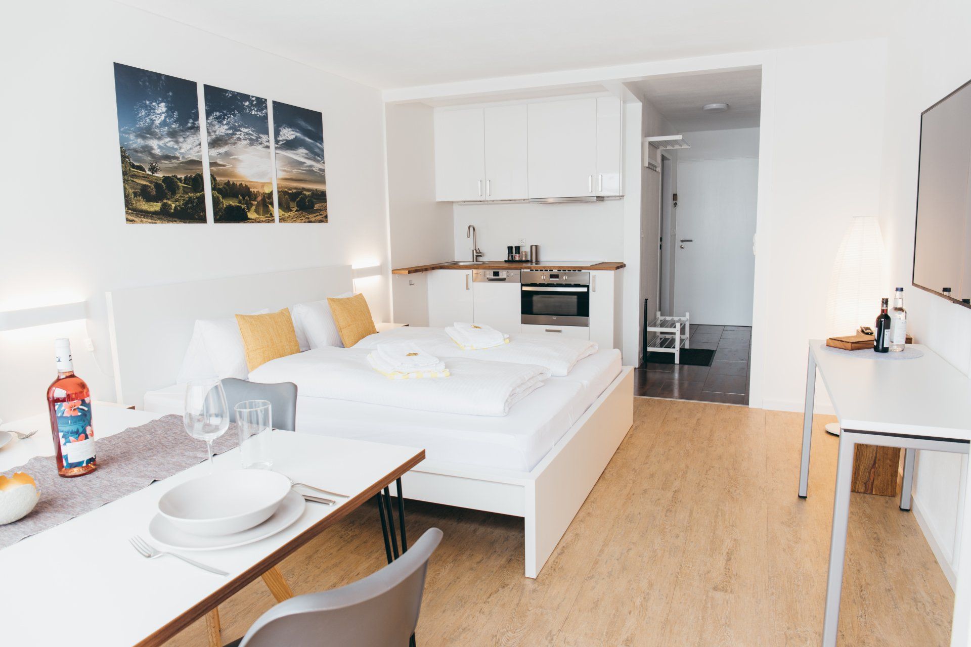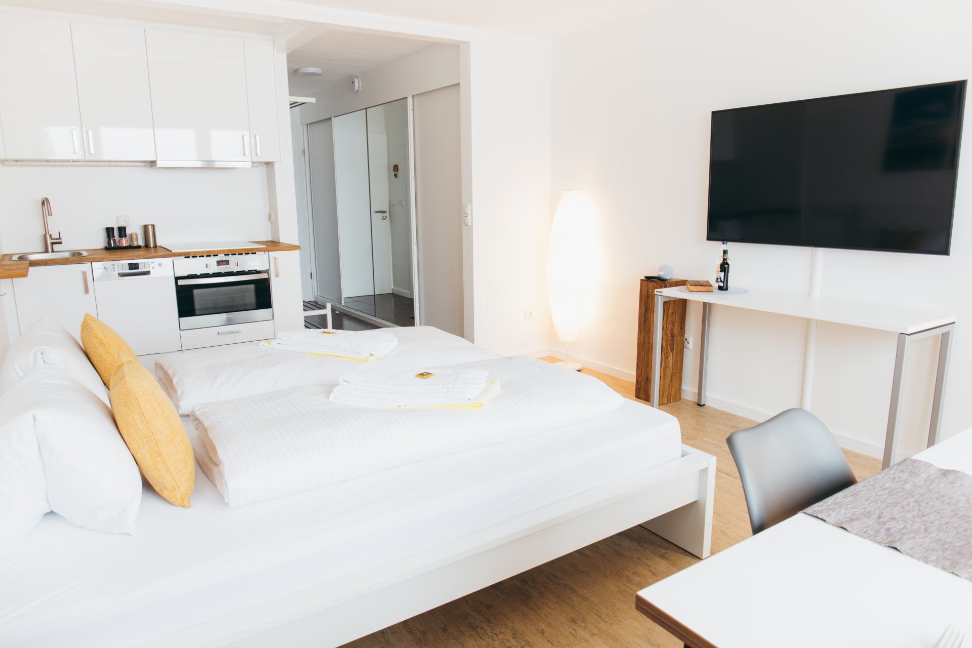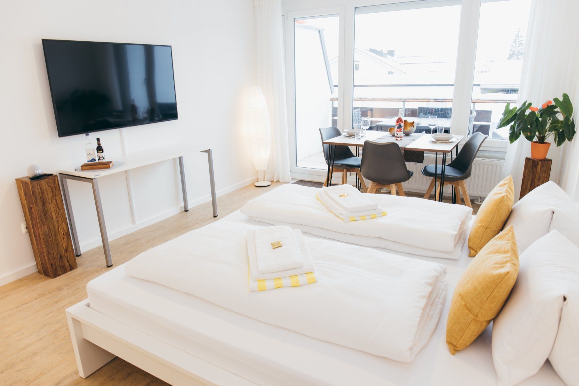Unser Studio 203 ist perfekt für einen Urlaub zu zweit. Alles was Sie brauchen, findet Sie hier. Vom Balkon hat man freie Sicht bis Sulzberg und sieht die Alpen über den Dächern hervorschauen. Das Bad ist mit einer Dusche ausgestattet.