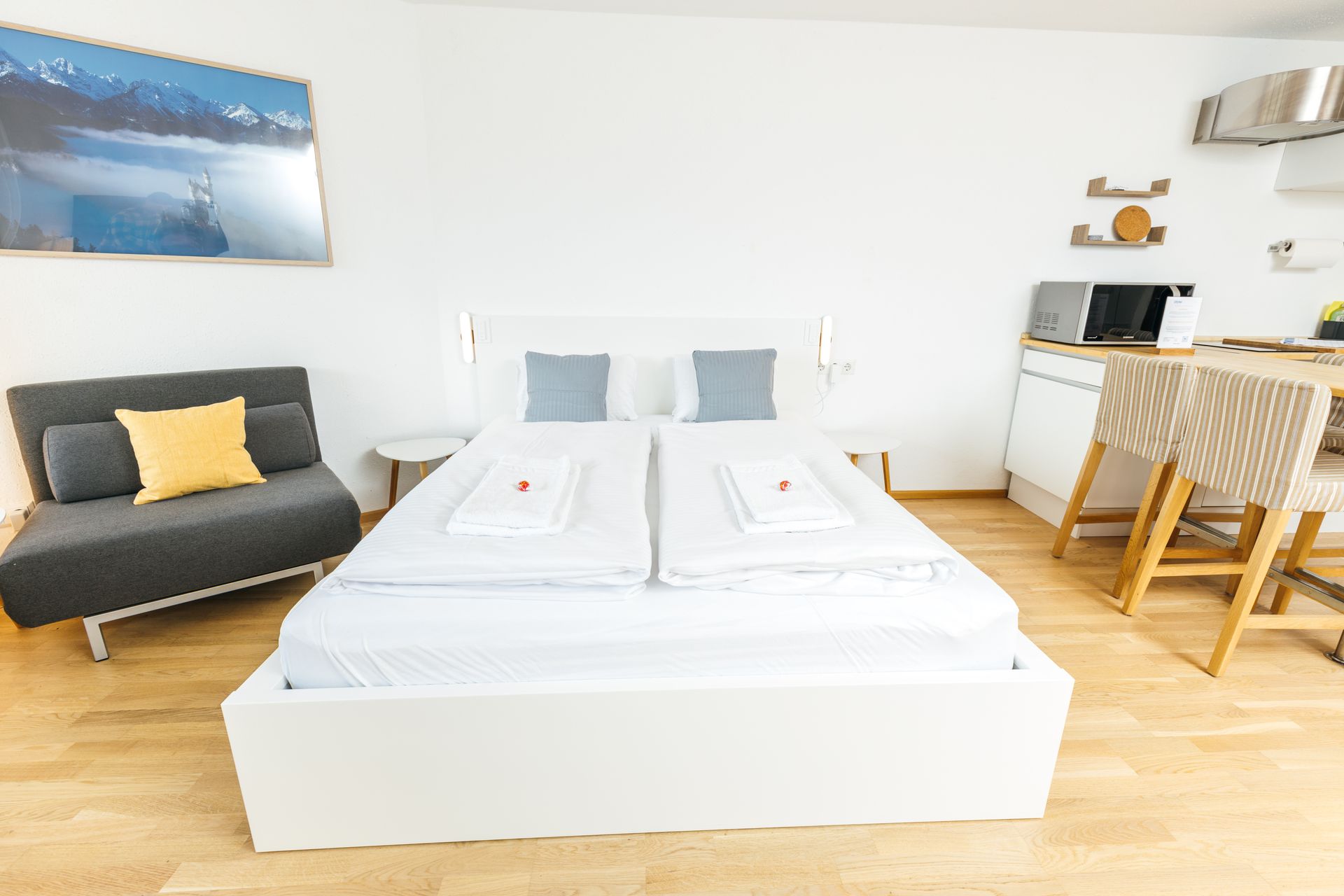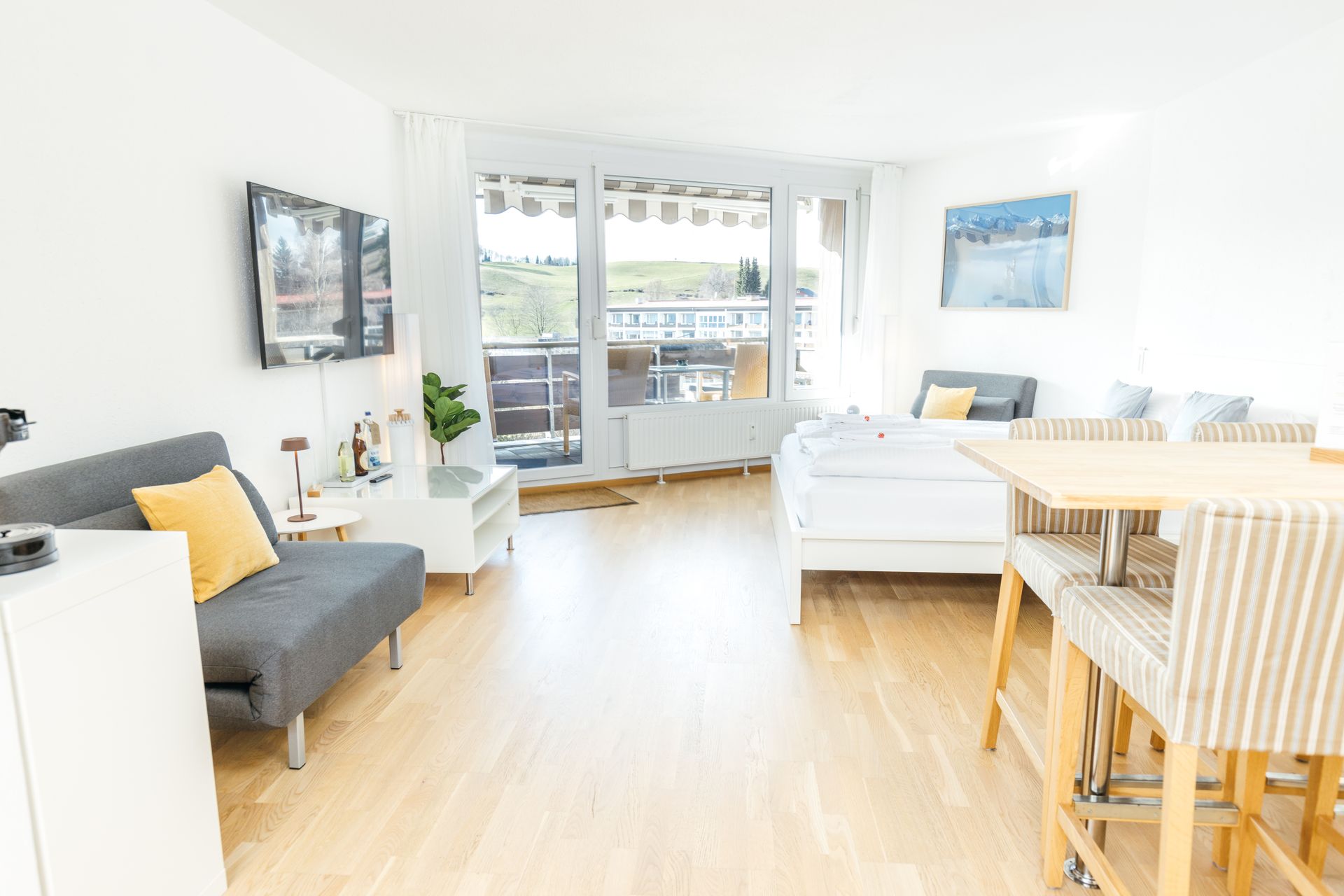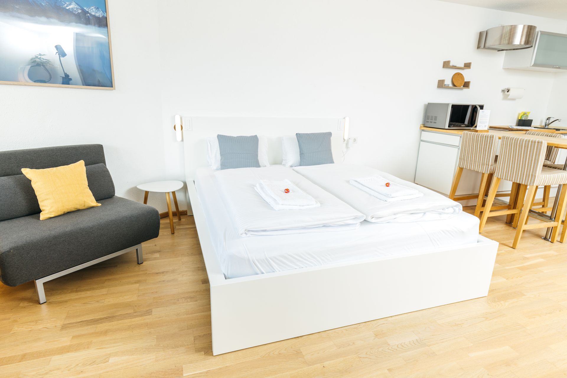 Das Studio 26 lädt mit seinem großzügigen Balkon ein, die Berge und die Natur zu genießen. Die große Küche (ohne Geschirrspüler) ist gut ausgestattet um sich selbst zu versorgen. Unsere bequemen Schlafsessel werden bei entsprechender Belegung zu vollwertigen, bequemen Betten umgebaut. Das Bad ist mit einer Dusche ausgestattet.