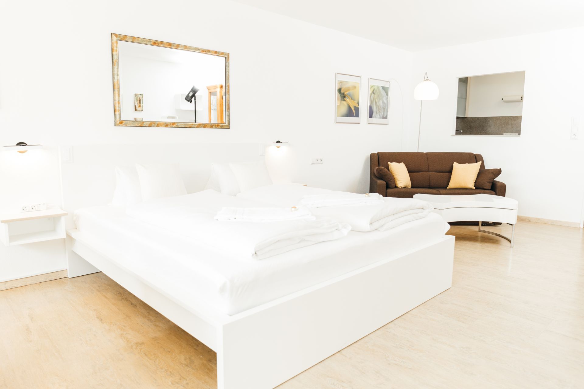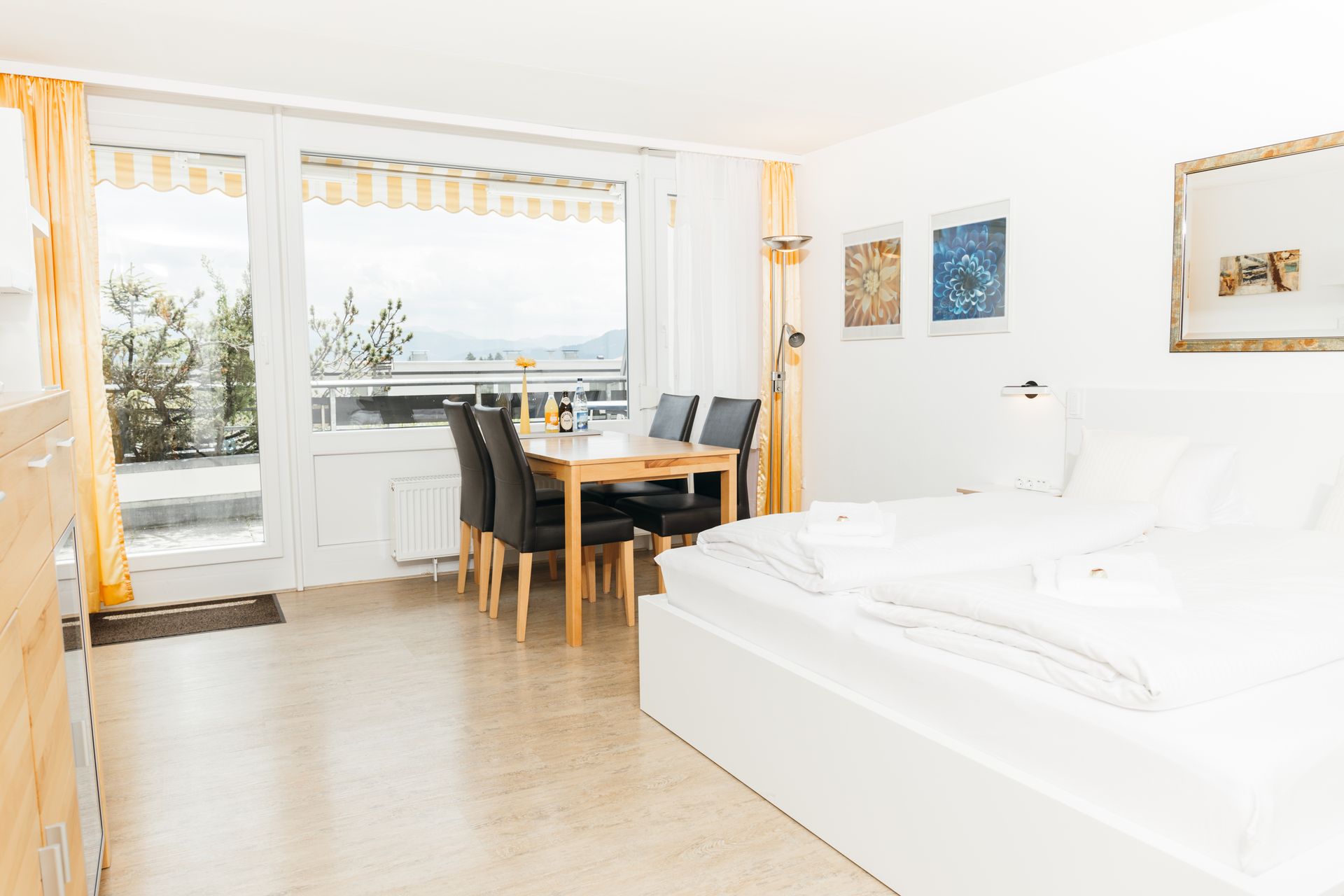 Ein modernes Studio mit Platz für bis zu 4 Personen, ausgestattet mit einem Doppelbett (180cm) und einer Schlafcouch (140cm). Die kleine Kochnische bietet alle notwendigen Utensilien. Das Badezimmer verfügt über eine Dusche. Der Balkon mit Bergblick lädt zum Entspannen ein.