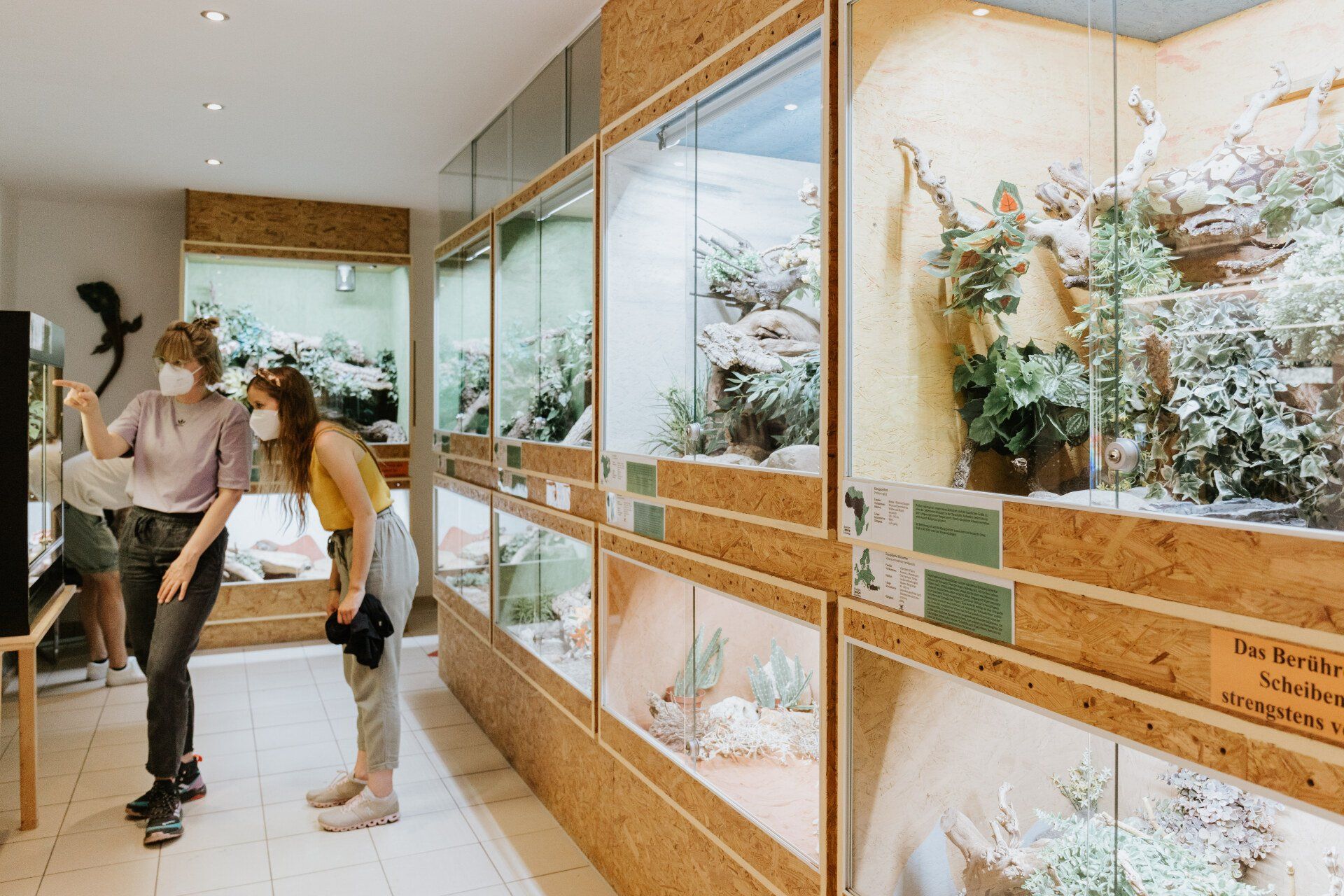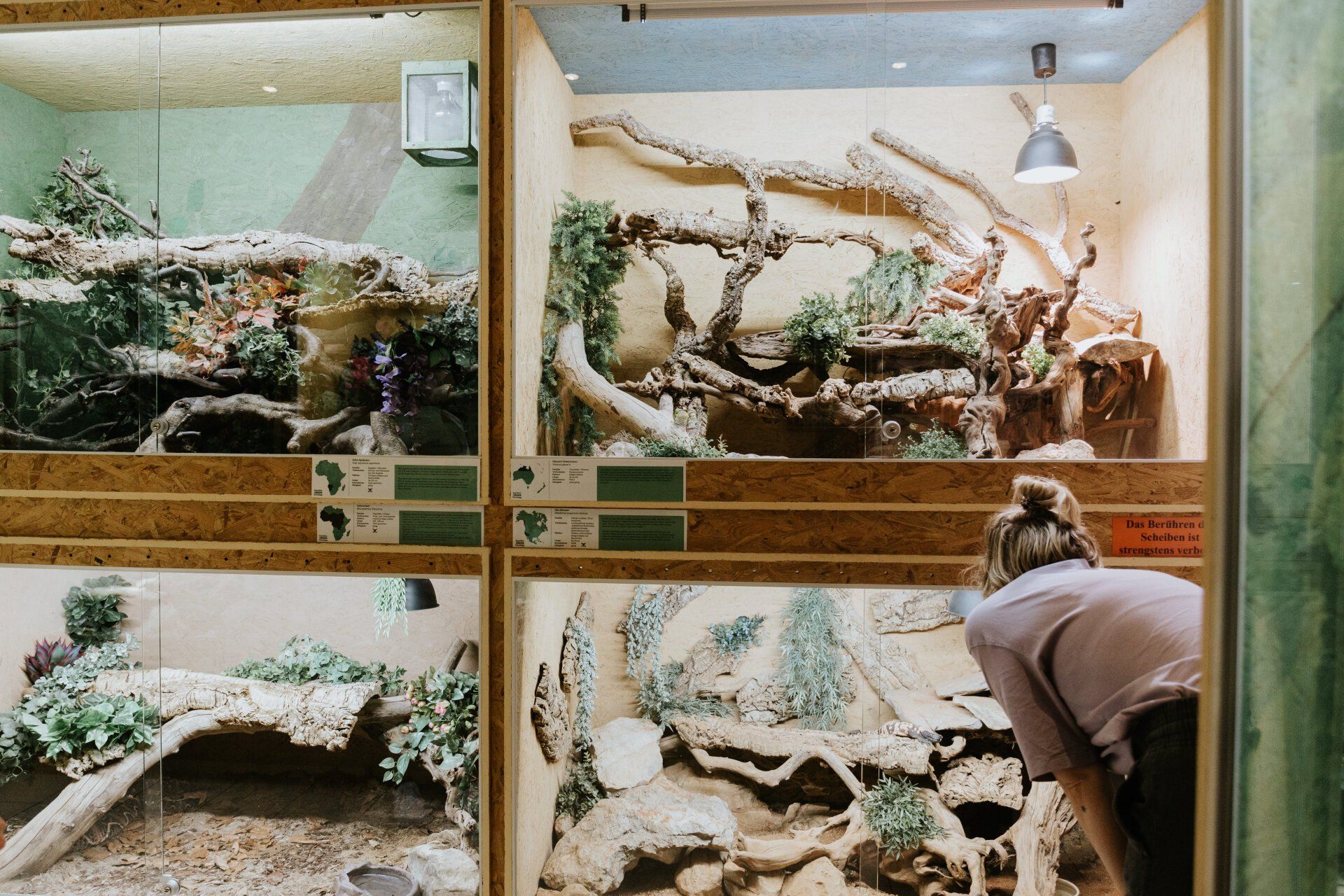 In den über 60 naturgetreu eingerichteten Terrarien des Reptilienzoos kann man viele verschiedene Reptilien wie Krokodile, Echsen, Warane, giftige und ungiftige Schlangen sowie Spinnen und Skorpione bewundern. Von den tödlich giftigen Kobras und Mambas über die kräftigen Würgeschlangen wie Boas und Pythons bis hin zu den niedlichen Geckos und Fröschen sowie den haarigen Vogelspinnen.